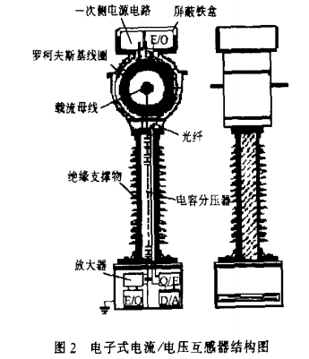 電流互感器設(shè)備由電流檢測(cè)單元和電壓檢測(cè)單元兩部分組成。前者選用羅柯夫斯基線圈作為電流傳感器,有源電子器材結(jié)束信號(hào)的數(shù)宇調(diào)制;后者選用電容分壓器作為電壓傳感器。高壓端電子線路電源由-一個(gè)輔佐電源感應(yīng)線圈直接從母線上獲取。羅氏線圈和電源感應(yīng)線圈安裝在母線上。高壓端信號(hào)調(diào)制和電源調(diào)度電路板置于·一個(gè)鐵磁屏蔽盒中,電流信號(hào)在高壓端經(jīng)AD轉(zhuǎn)換、E/O轉(zhuǎn)換后調(diào)制成光信號(hào),經(jīng)過光纖傳送到低電位端。依據(jù)需求,可以將信號(hào)繼續(xù)用光纖傳送到遠(yuǎn)方的控制室,也可以就地經(jīng)O/E、D/A轉(zhuǎn)換,放大成仿照電流信號(hào),母線電壓經(jīng)電容分壓器轉(zhuǎn)換成低壓信號(hào)后,調(diào)制成光信號(hào),經(jīng)光纖傳送到控制室,也可以就地經(jīng)校準(zhǔn)、溫度補(bǔ)償后,給出仿照電壓信號(hào)、一個(gè)陶瓷套管既用作高壓部分元件的絕緣支撐,一同又是傳輸電流信號(hào)的光纖和電容分壓器的通道。
