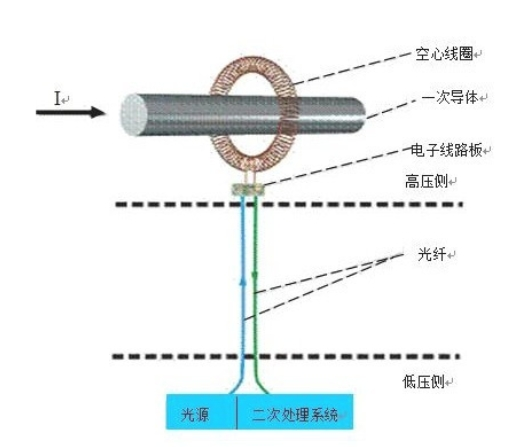 有源型電子式電流互感器特色是一次傳感器為空心線圈,高壓側電子器件需求由電源供電方能作業。其原理如下圖所示: