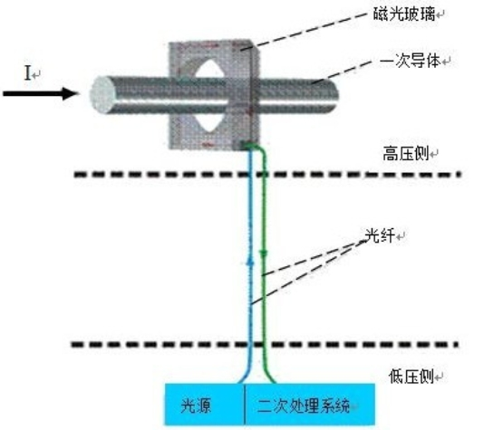 無源磁光玻璃型電子式電流互感器特色是一次傳感器為磁光玻璃,無需電源供電。其原理如下圖所示:
