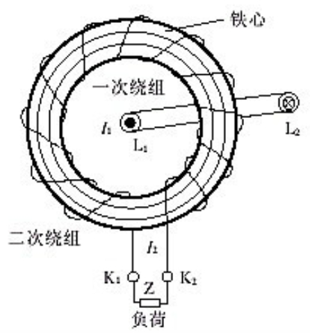 穿心式電流互感器其自身結構不設一次繞組,載流(負荷電流)導線由L1至L2穿過由硅鋼片搟卷制成的圓形(或其他形狀)鐵心起一次繞組作用。二次繞組直接均勻地纏繞在圓形鐵心上,與表面、繼電器、變送器等電流線圈的二次負荷串聯構成閉合回路,由于穿心式電流互感器不設一次繞組,其變比根據一次繞組穿過互感器鐵心中的匝數承認,穿心匝數越多,變比越小;反之,穿心匝數越少,變比越大,額定電流比I1/n:式中I1——穿心一匝時一次額定電流;n——穿心匝數。
