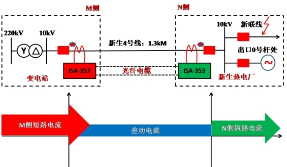 2007年8月5日某220kV變電站10kV重生4號線光纖分相電流差動保護動作,開關(guān)跳閘,經(jīng)巡線人員檢查、毛病點在新聯(lián)線出口0號桿處保護人員檢查兩邊保護裝置,仿照區(qū)內(nèi)外毛病保護均反應正確,如下圖所示,試剖析跳閘緣由。